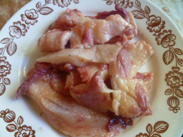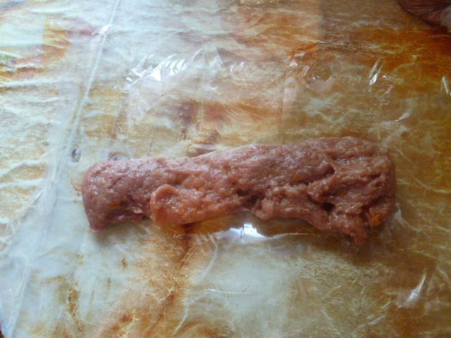 Для этой порции сосисок( 8 шт), я обрезаю мясо с одного гуся: грудку с шкурой и немного с ножек.