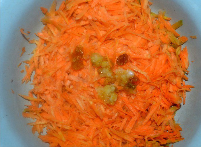 К натертой моркови добавляем изюм из физалиса. У меня растет земляничный, из него получается очень вкусный и полезный изюм. Можно добавит и просто изюм или курагу, будет очень вкусно!