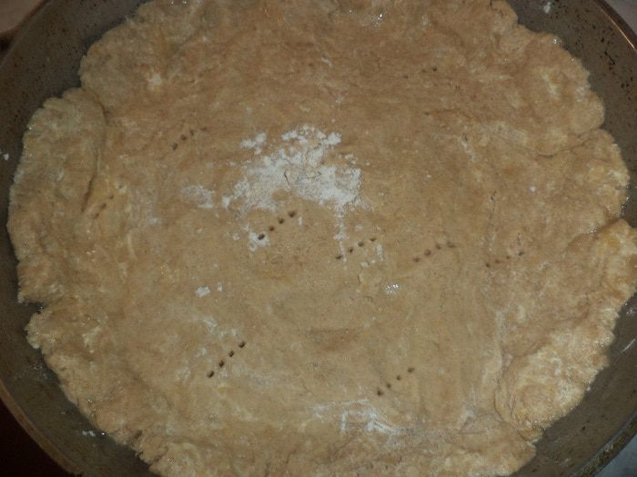 Раскатать тесто в круглый корж, выложить его в смазанную маслом форму для выпечки, наколоть тесто вилкой и выпекать 15 минут при температуре 180 градусов.