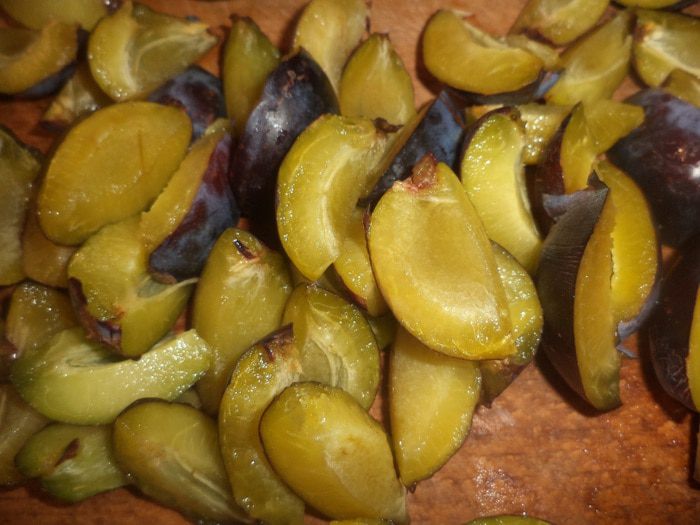 У слив удалить косточки, нарезать дольками.
