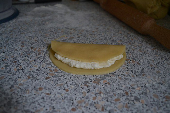 Тесто раскатать. Вырезать кружки диаметром 13 см.