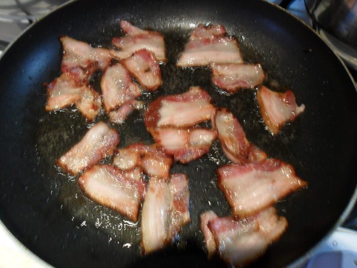 Бекон обжарить на сковороде без масла до золотистого цвета, а точнее, чтобы он стал хрустящим. Вынуть на бумажную салфетку, чтоб убрать лишний жир.