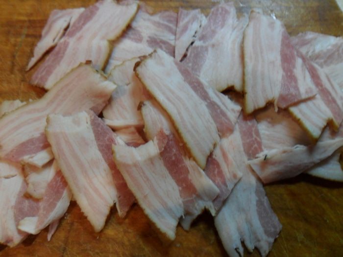 Бекон порезать тонко, тонко.