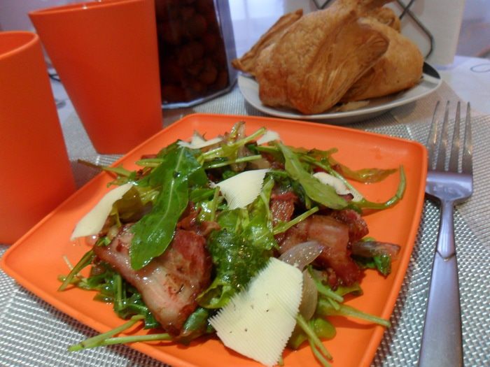 Ну просто очень вкусный салат, правда, не очень полезный из-за жареного бекона, но иногда же можно себе позволить)))