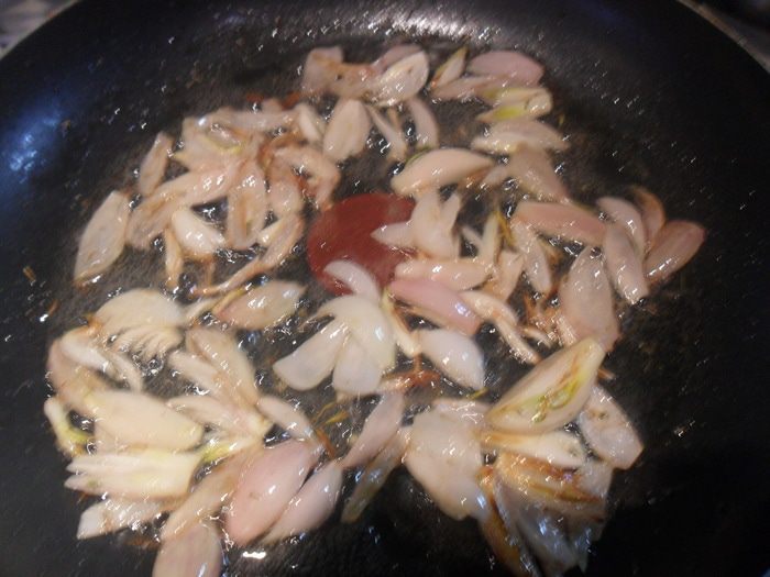 Лук-шалот нарезать на 4 части.