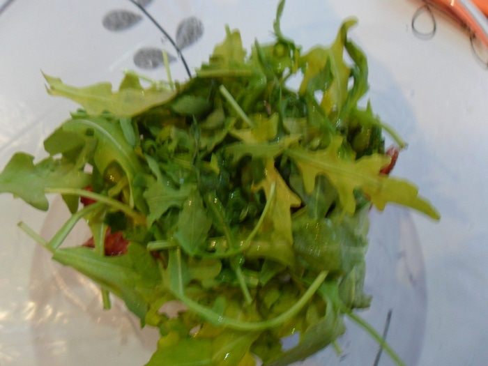 В салатник выложить руколу, бекон, лук вместе с маслом. Полить бальзамическим уксусом. Перемешать.