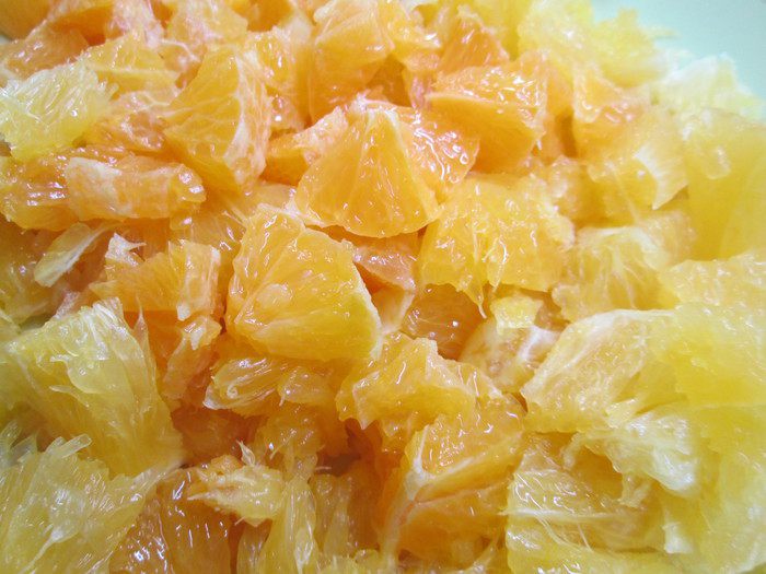 Очистите цитрусы от кожуры, нарежьте небольшими кусочками.