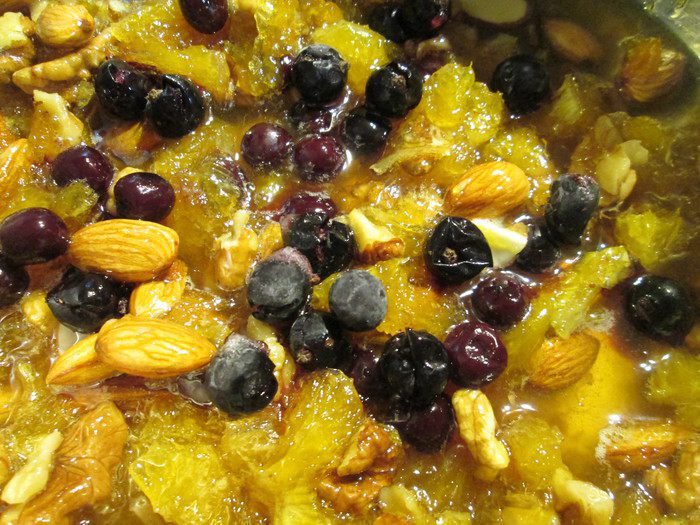 Снимите с плиты и добавьте орехи, мед и ягоды черной смородины(можно замороженной). Отставьте охлаждаться.
