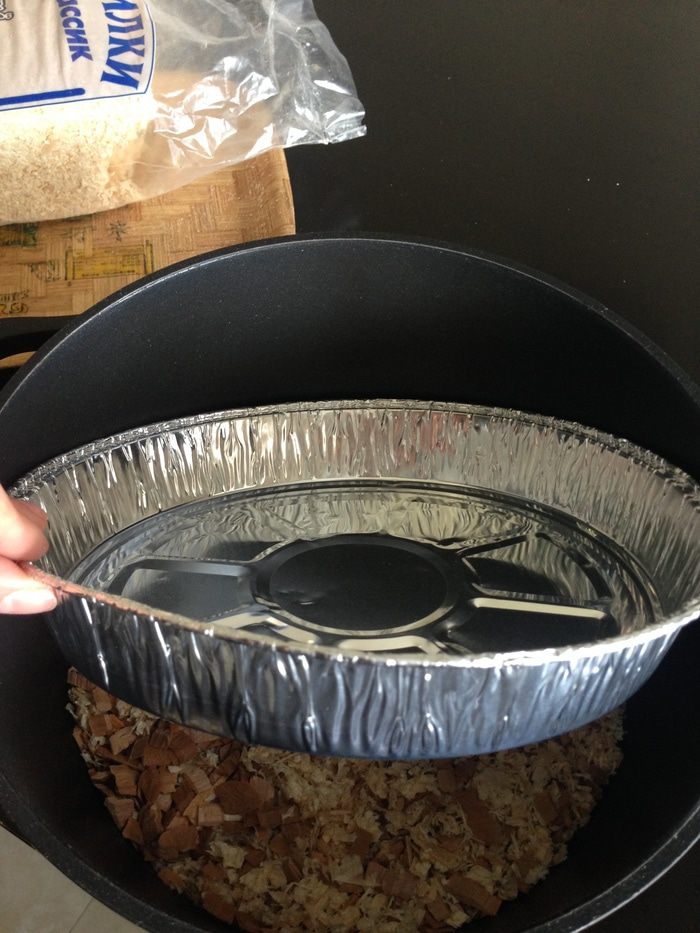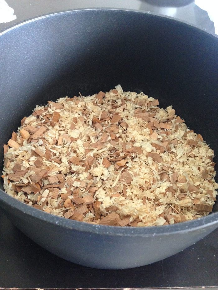 На фото два варианта опилок: слева более темные - это щепа для копчения из ольхи, продается в супермаркетах, справа более светлая - это опилки для кроликов из зоомагазина. Обычно я использую только одни из них, а иногда смешиваю, это не принципиально.