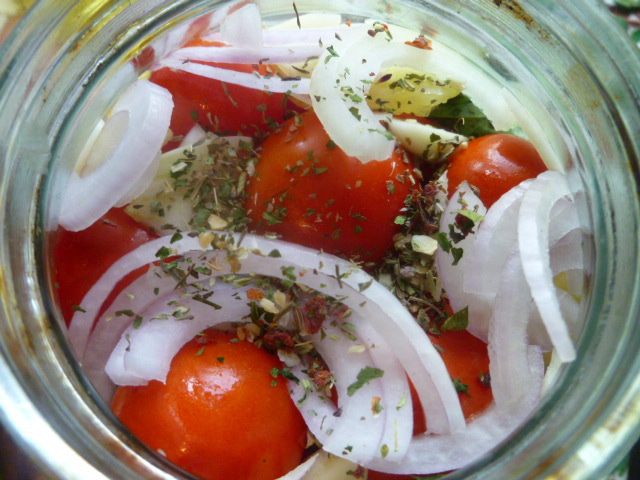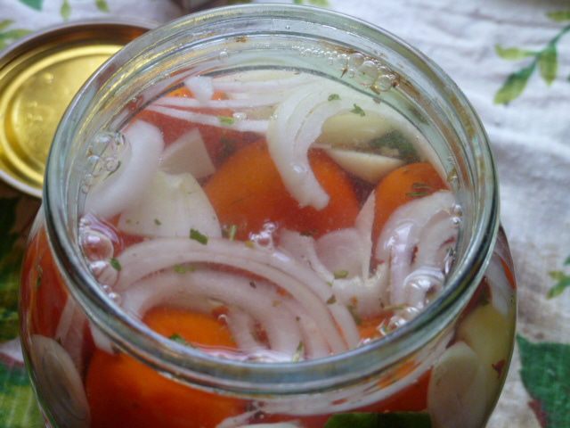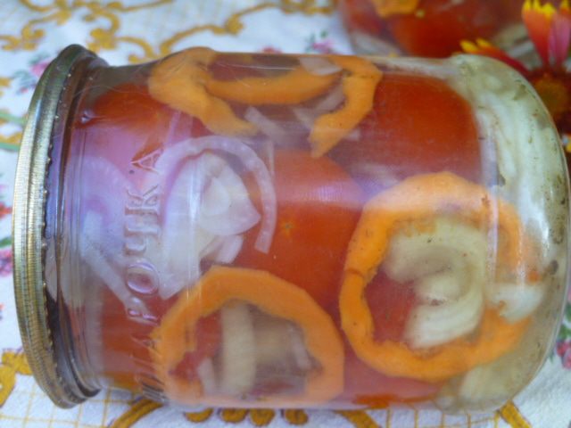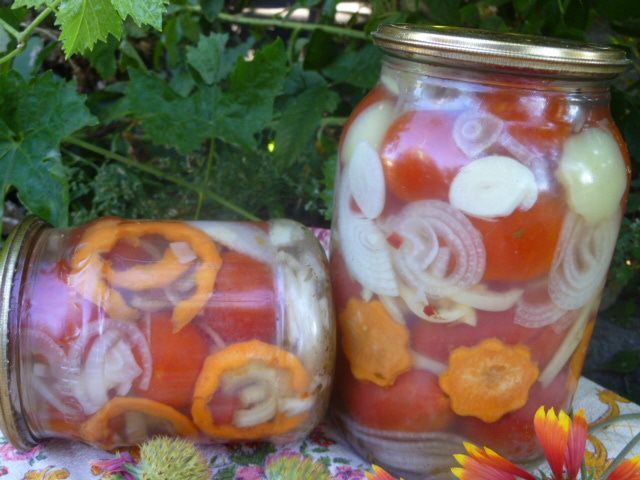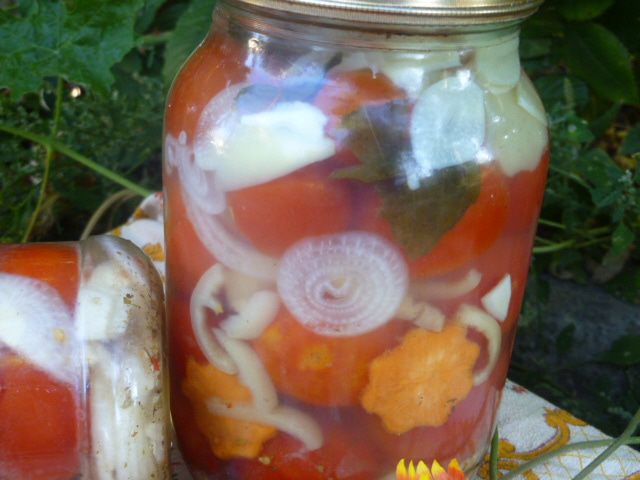 Залить помидоры с овощами и сразу закатать. Перевернуть дном вверх и укутать до полного остывания.