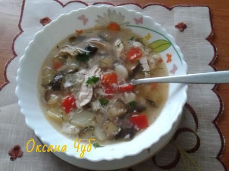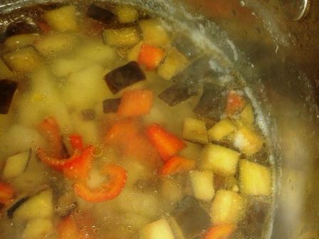 В картофель, который уже 5 минут как кипит, добавим тушеные овощи и дадим им повариться минутки 3. У меня за это время картофель был почти готов. Приправим перцем и добавим куриное мясо.