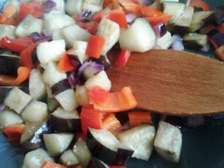 Половинку луковицы нарежем не очень мелко, нарежем баклажан и перец средними кубиками и обжарим все вместе на масле около 5 минут, помешивая. Добавим соевый соус и потушим еще 2 минутки.