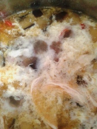 Яйцо взбить вилочкой в миске. Добавить его в суп, постоянно помешивая. Варить 1 минуту.