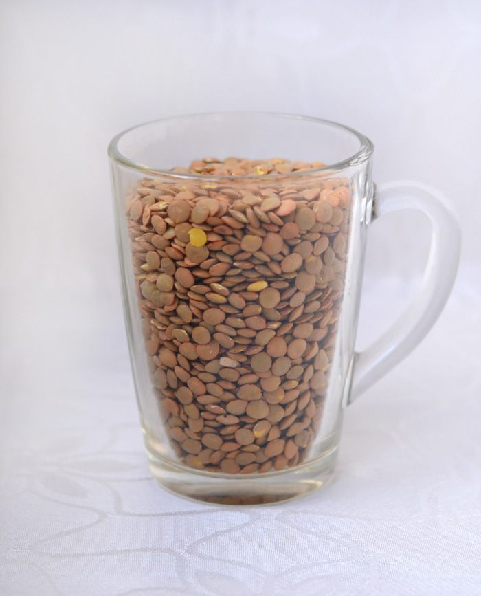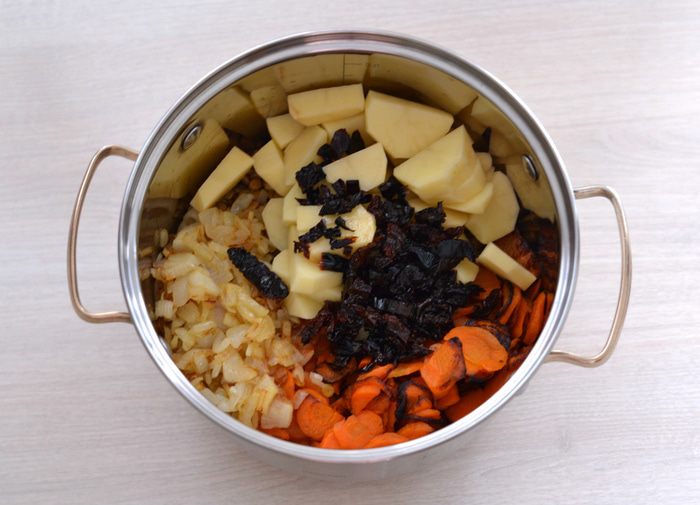 В глубокую кастрюлю насыпать чечевицу, выложить лук с чесноком, морковь и картофель. Залить водой, посолить, поперчить, добавить лавровый лист. Варить примерно 35 минут на среднем огне.