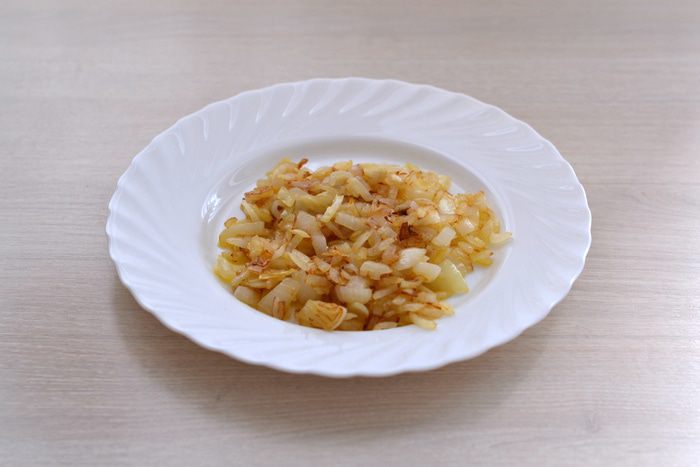 Большую головку лука почистить, порезать, пассировать вместе с измельченным чесноком на оливковом масле до золотистого цвета