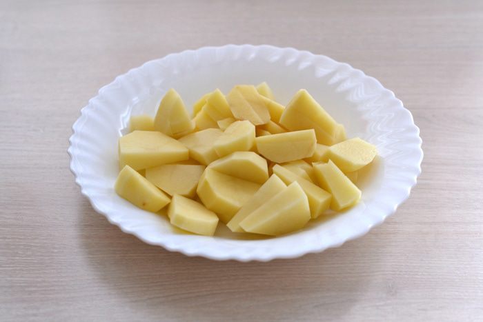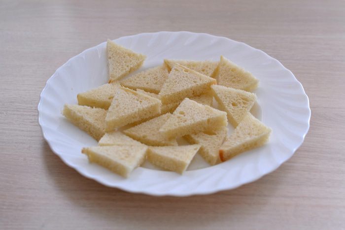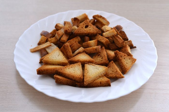 Готовим гренки. Хлеб порезать на кусочки произвольной формы.