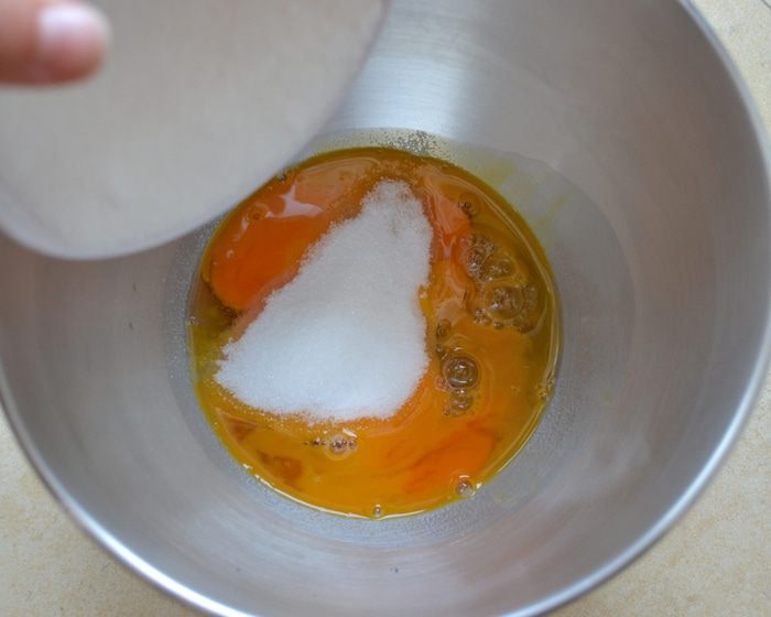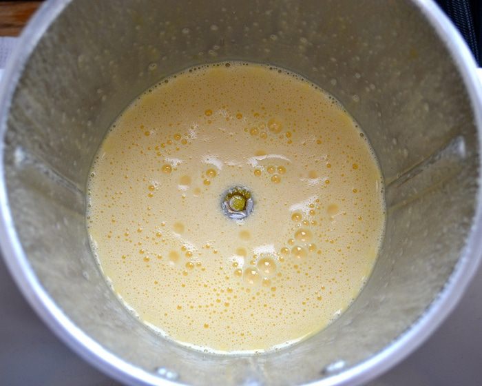 Для приготовления теста используем блендер (и моем потом, соответственно, тоже только его!). Хотя можно и вручную, венчиком! Итак, в чашу блендера разбить яйца, добавить щепотку соли и сахар. Включить блендер и взбить все в течение 1 минуты.