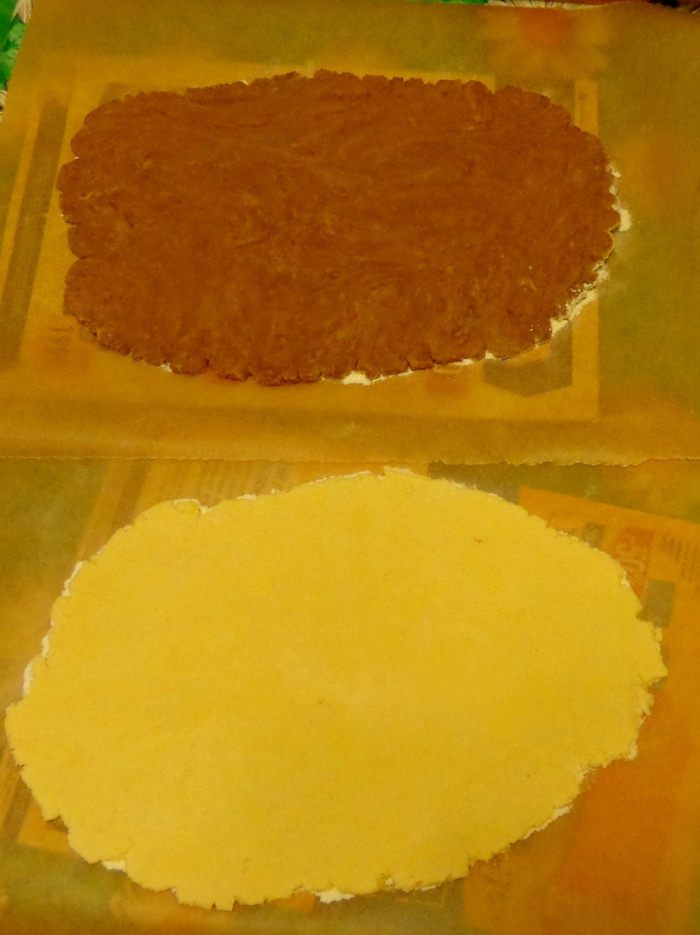 Замесить тесто, колобки раскатать толщиной 0.5 см и отправить пласты в холодильник на 1 час.