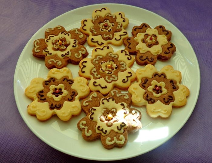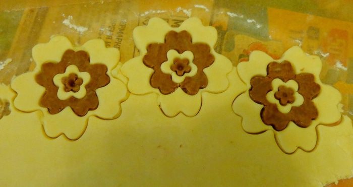 Размягченное сливочное масло взбить с сахарной пудрой, добавить ванильный экстракт, затем соль, 6 ст. л. муки и разрыхлитель. Тесто разделить на 2 части. В одну добавить 1 ст. л. муки, в другую - 1 ст. л. какао.
