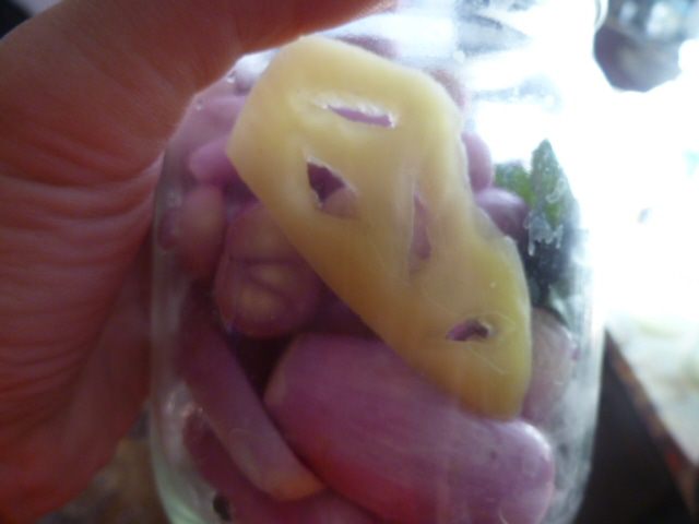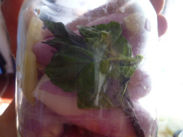 Затем укладываем плотно лук, не забывая положить кусочек перца и веточку базилика.