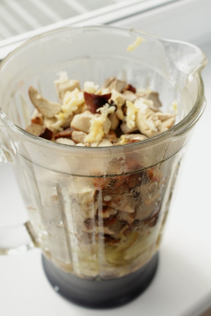 Баклажаны и грибы сложить в блендер и измельчить, выдавить чеснок.