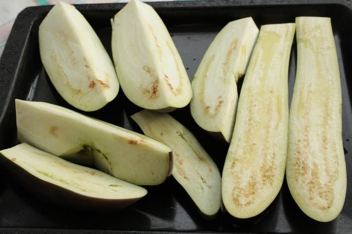 Баклажаны разрезать, смазать растительным маслом и запечь в духовке до мягкости мин 40.
