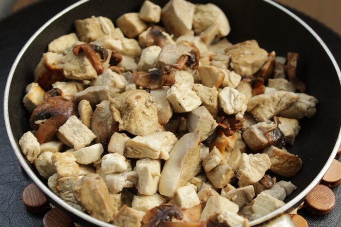 Грибы нарезать и обжарить на растительном масле до испарения жидкости, посолить, поперчить