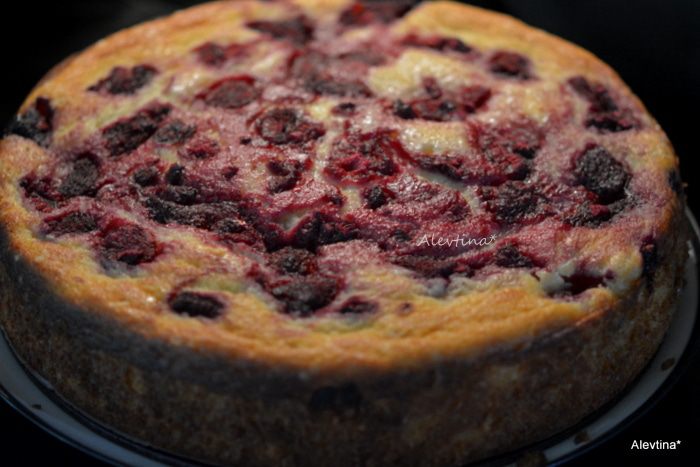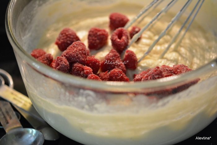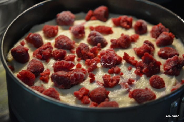 Вылить тесто в приготовленную смазанную форму. Распределить сверху второй стакан малины. Поставить в разогретую духовку на 50-55 мин.