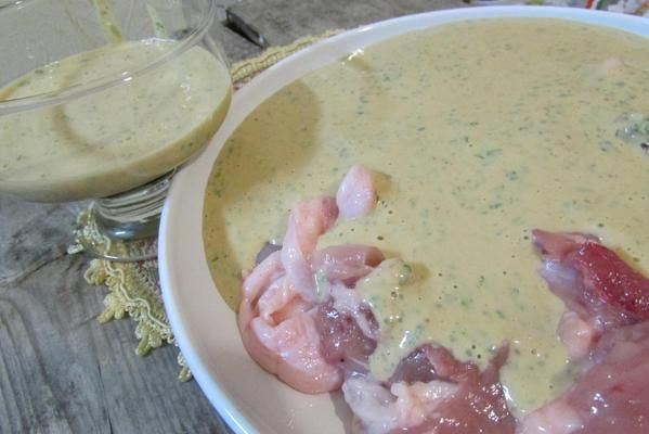 Взбить в чаше блендера чеснок, йогурт, сахар, соль, лимонный сок, кокосовое молоко и арахисовую пасту (арахисовую пасту можно приготовить самостоятельно: измельчить в блендере обжаренный арахис, добавив немного растительного масла, мне домашняя нравится даже больше, чем магазинная). Добавить перчик чили и кинзу, перемешать с маринадом.