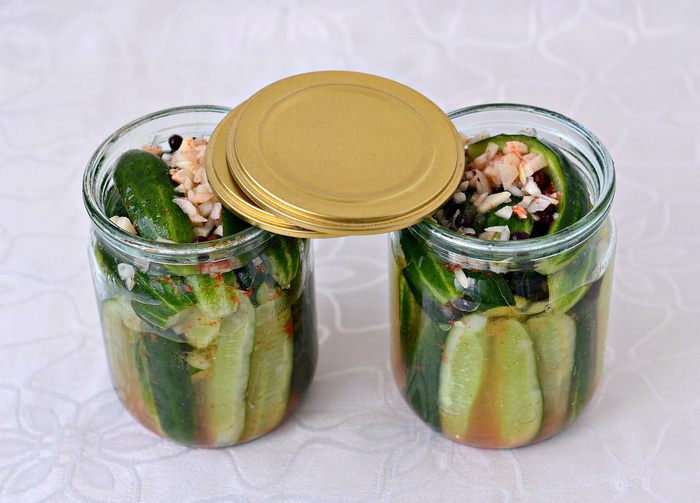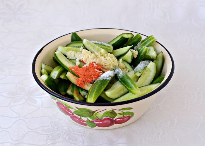 Добавить соль, сахар, мелко порубленный чеснок, красный молотый перец. Добавить масло и уксус 9%. Хорошо перемешать. Дать постоять 2 часа, периодически перемешивать. Огурцы дадут сок, пропитавшись заправкой, а так же сильный аромат малосольных огурцов.