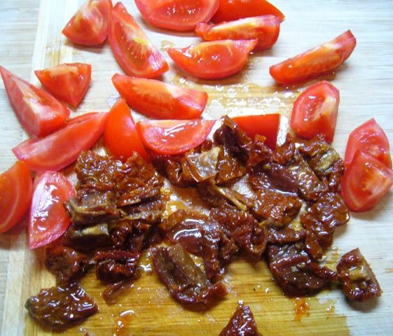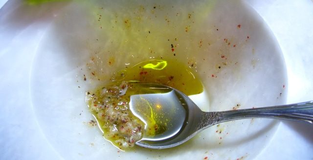 Чеснок, соль, сахар, розовый и черный перец истолочь в ступке.