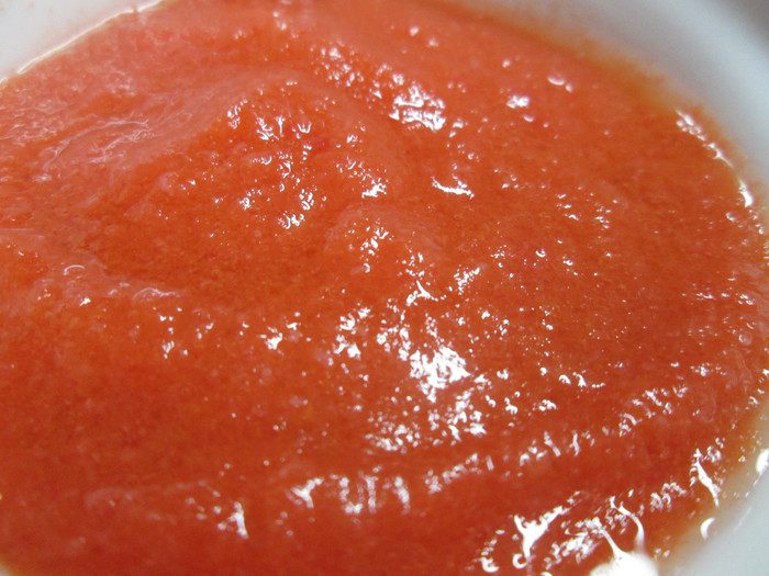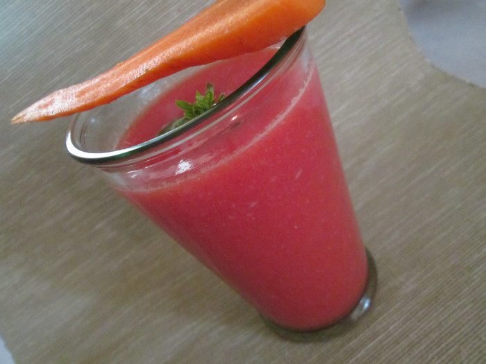 В кипящей воде бланшируйте цветную капусту 3 минуты, предварительно разобрав на соцветия. Взбейте в блендере. Добавьте морковный сок (в списке указан как морковь - 400 мл) и томатное пюре и еще раз взбейте. Посолите по вкусу и если вы любите остроту, добавьте соус тобаско.