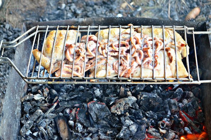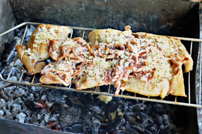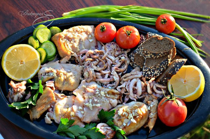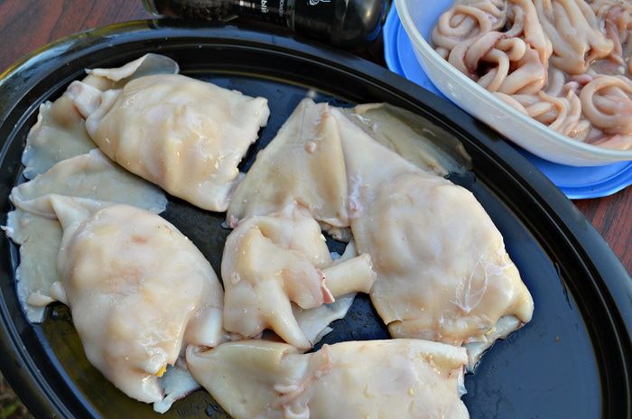 Кальмары (450 г) и щупальцы кальмар (350 г) разморозить. Хорошо, конечно, если у вас есть возможность приготовить свежевыловленные морепродукты, но, за неимением, используем быстрой заморозки. Хорошо промыть, очистить от плёнок. Сложить кальмары в миску, слегка подсолить, влить 1 ст. л. соевого соуса и перемешать. Накрыть ёмкость крышкой и оставить на 30 минут.