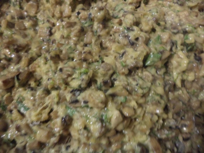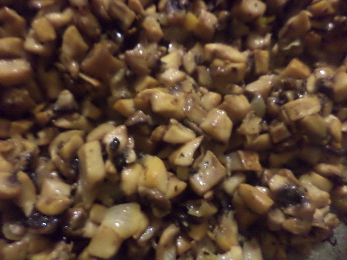 В большой сковороде на смеси масел (сливочное и половина растительного масла) обжарить лук. Когда он начнёт золотиться, добавить грибы, посолить, поперчить и обжаривать до зарумянивания грибов.
