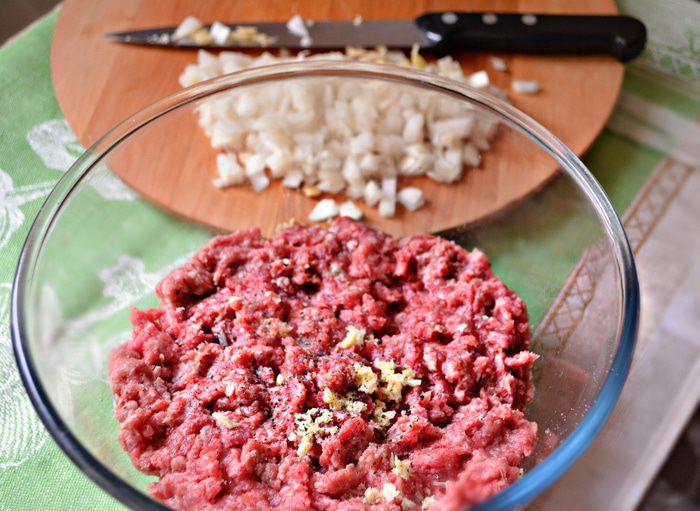 Обрежьте горлышко у пластиковой бутылки, оно понадобится для формовки чевапчичей. Фарш еще раз перемешайте руками, наполните горлышко бутылки фаршем и, проталкивая его через отверстие, «отсадите» колбаски на разделочную доску.
