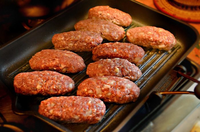 Колбаски можно скатать и руками (в этот раз я так и сделала), но проходя через горлышко бутылки, фарш дополнительно уплотняется, и изделия получаются ровные, одинакового размера (5-7 см).
