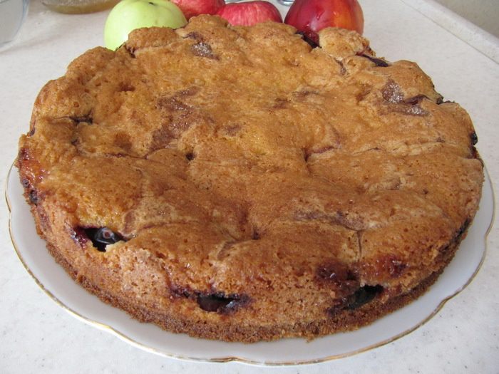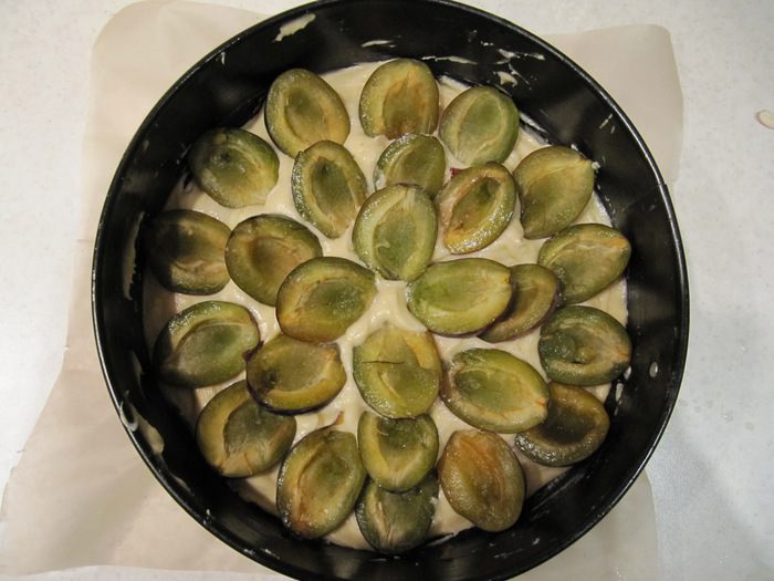 На дно формы выложить тесто, разровнять. Сверху слегка утопить в тесто сливы разрезом вверх. Количество слив зависит от их размера. У меня ушло 13 штук. Посыпать сливы сахарно-коричной смесью.