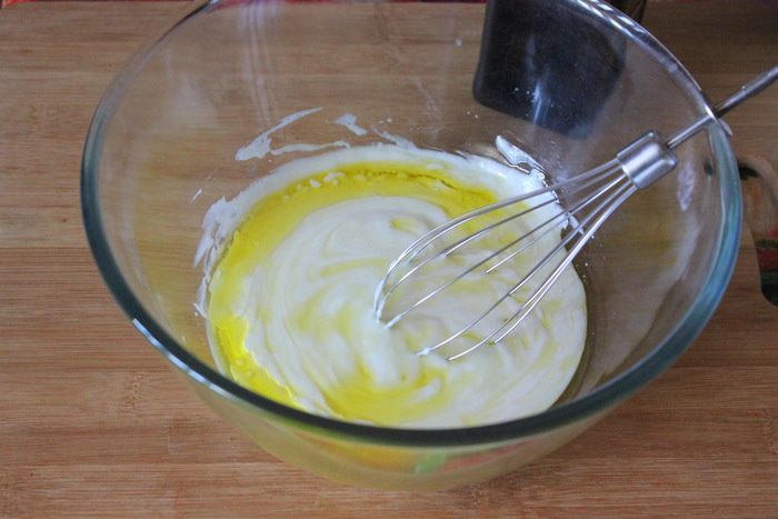 В одной миске соединить вместе творог, йогурт и оливковое масло.