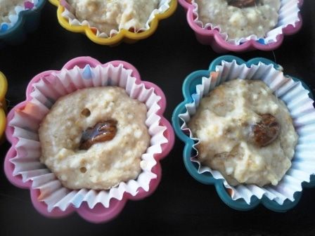 Разрыхлитель смешиваем с мукой и оба вида муки добавляем к тесту и вымешиваем. Раскладываем по формочкам (ни бумажные, ни силиконовые формы я не смазываю). Формочки заполняем наполовину. У меня получилось 12 штук.