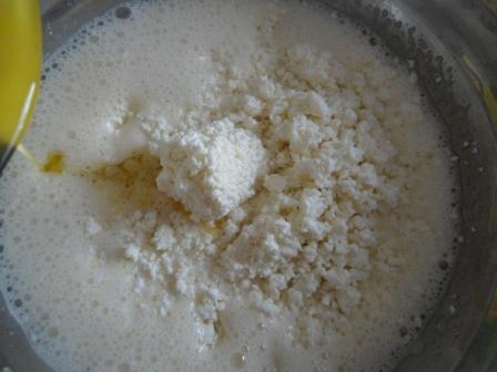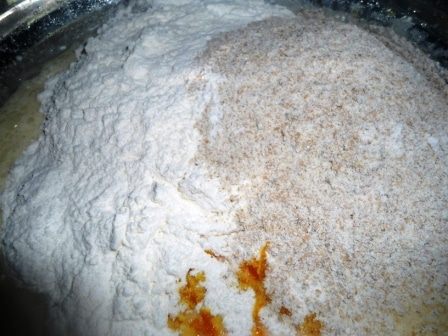 Маргарин растопить и немного остудить. В яйца добавляем творог, маргарин, сметану, взбиваем миксером. Цедру апельсина натираем на мелкой терке и добавляем к тесту.