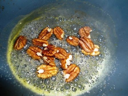 Делаем карамель: выжимаем сок из апельсина (у меня ушла половинка) в сотейнике. Нагреем сок с сахаром, проварим 1 минуту, добавим половинки орешков пекан и карамелизуем ещё 1 минутку.