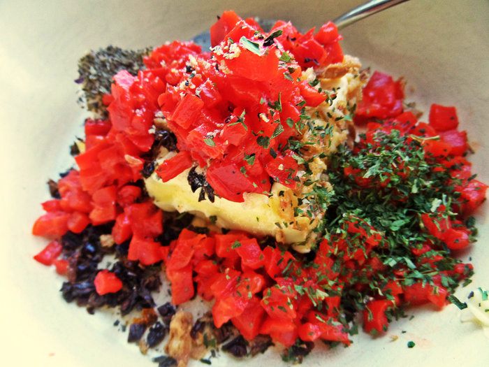 Высыпаем к маслу. Посыпала ещё лимонным перцем,но можно простым и немного цедры лимона.