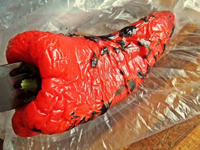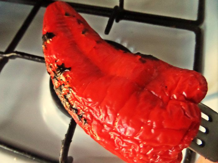 В жару не хотелось нагревать духовку,решила по-ленивому обжечь перчик на открытом огне.