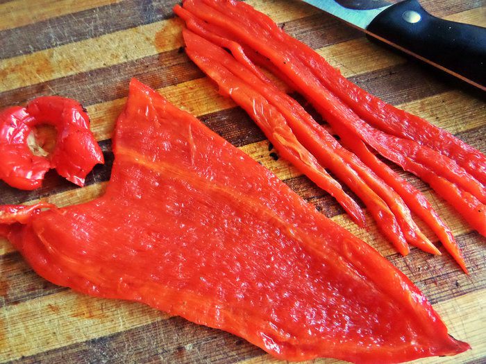 Настала очередь раскромсать перчик. Сначала на полоски.