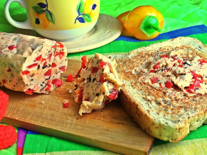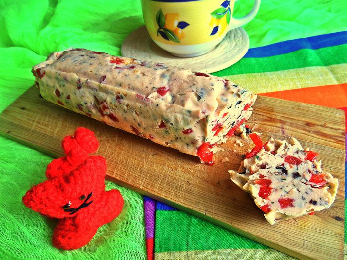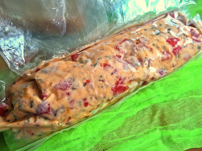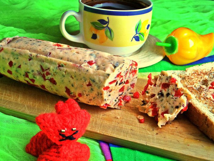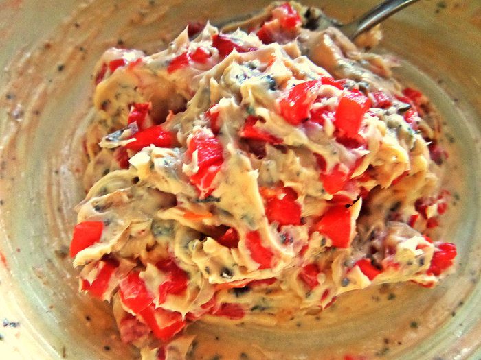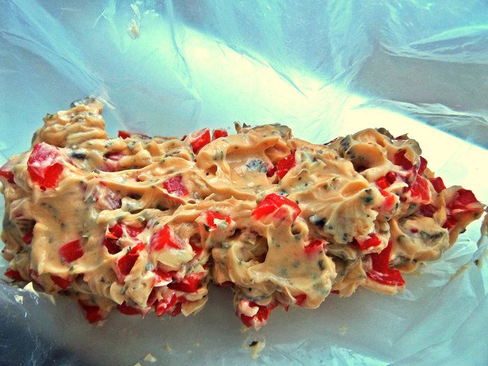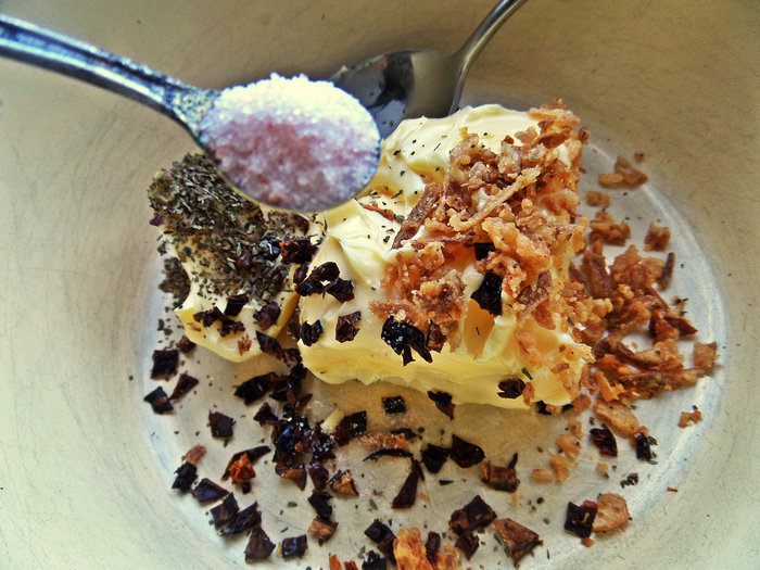 Мягкое масло (достаём заранее) смешиваем с томатной крошкой, базиликом, луком.