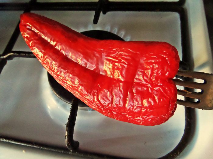 Накалываем на вилку и держим перец над огнём, равномерно поворачивая со всех сторон.