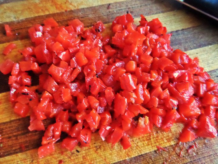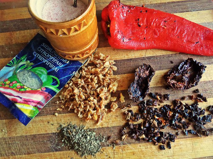 Затем ножом снимаем тонкую верхнюю кожицу,чистим серединку. Вяленые томаты мелко крошим. Лук готовый обжаренный,продаётся в отделах восточной кухни,он такой вкусный!