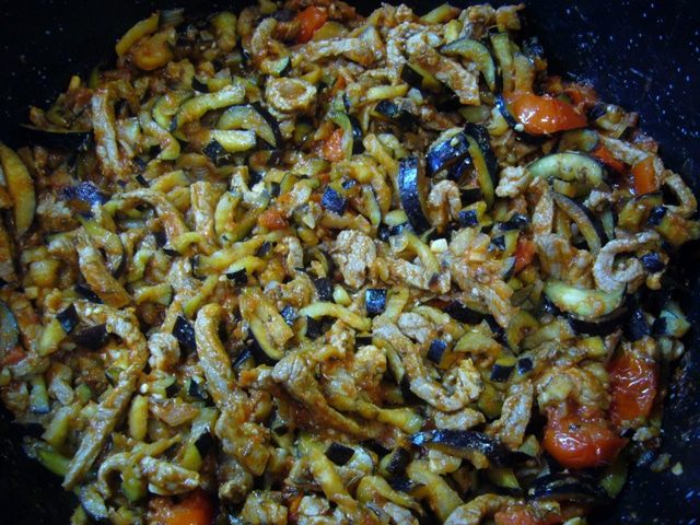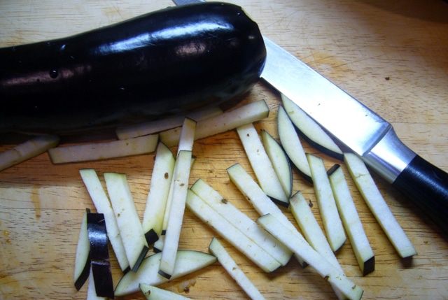 Баклажаны нарезать брусочками. Посолить. Оставить на 20 мин, чтобы вышла горечь.