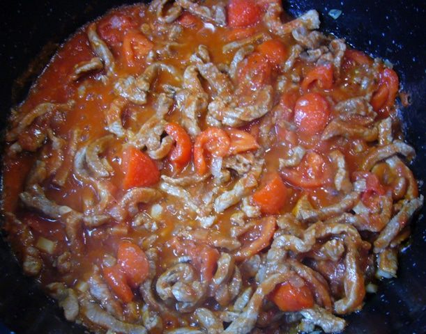 Теперь отправить в сотейник томатный соус и помидоры. Потушить в течение 5 мин.