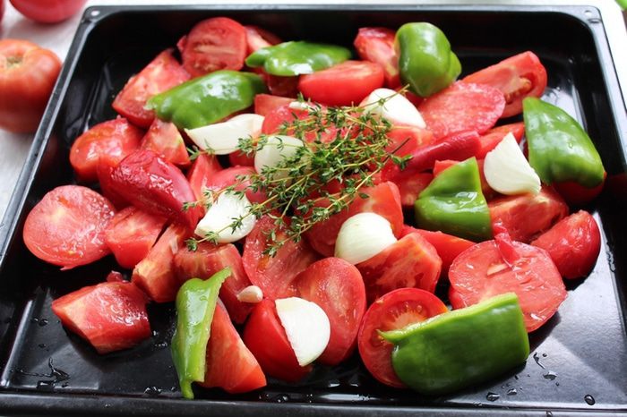 Противень обильно полить оливковым маслом, порезать крупными долями помидоры (предварительно снимите кожицу), перец болгарский, лук.